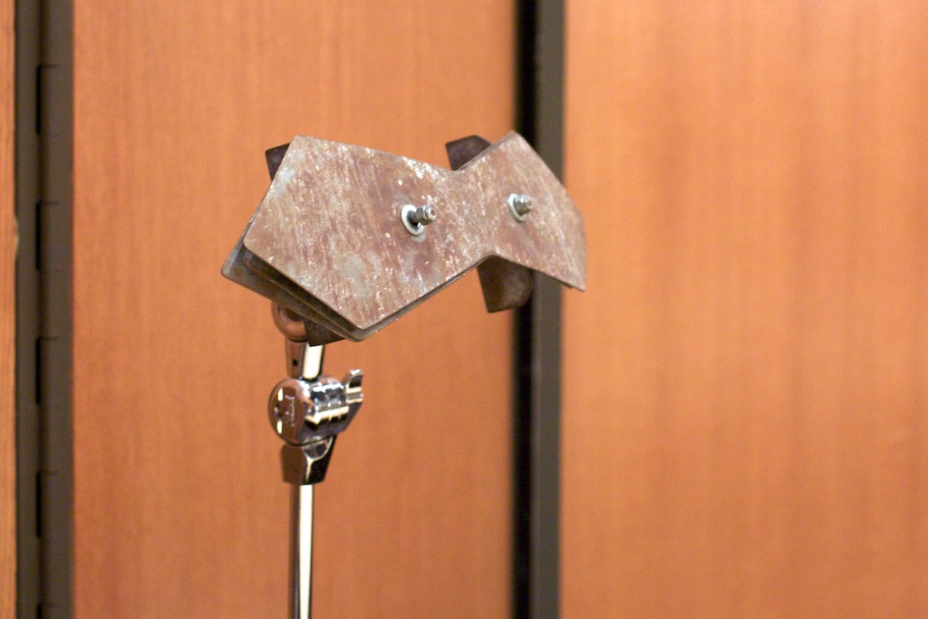 The best addition we made to the piece during the dress rehearsal was the addition of a marching field drum with a Kevlar head. It’s really a marching snare (with no snares), and it cuts through any texture. I had been looking for a good sound for all of the rim shots I have in the piece. I didn’t want to use an actual snare drum, since that’s what I want to reference in the piece, but I don’t want it to be literal. When the rim shots come in, the piece is at its maximum “heavy metal / Tool rip-off moment,” and an actual drum set snare drum would have been too easy a choice. I had been asking simply for a high tom-tom, but it wasn’t cutting enough.