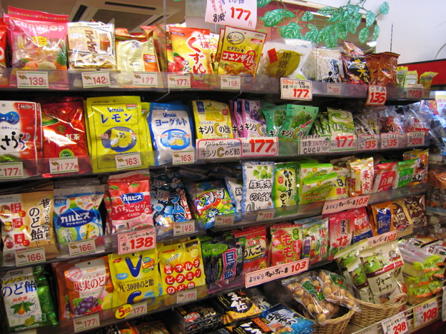 Snacks and sweets. If I could read Japanese characters, this would probably look like chaos, but since I can’t, it just looks to me like pretty colors with abstract characters.