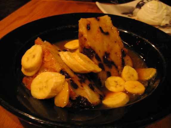 My dessert: chocolate chip and banana bread pudding with a rum-based sauce. I don’t know if it was an off night in the kitchen, but this was the weak link in the meal, as the rum had not been reduced nearly enough, causing the alcohol flavor to dominate the entire dish. Boo.